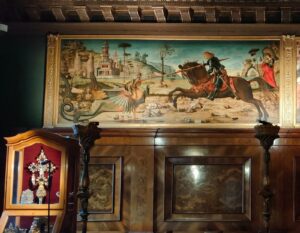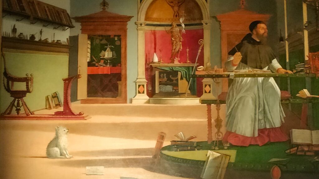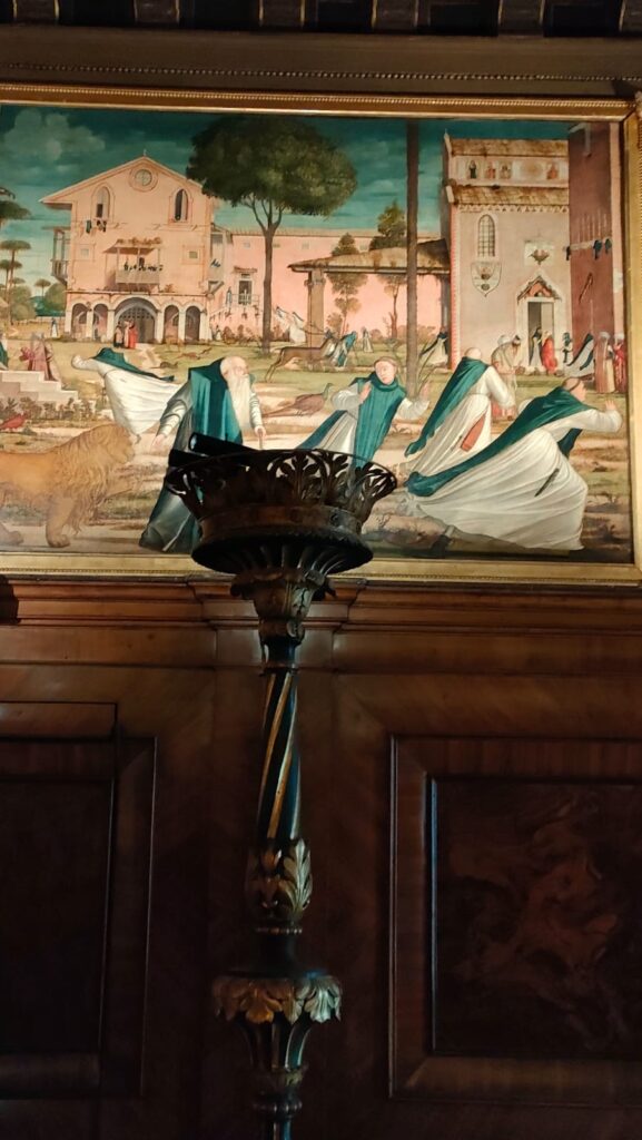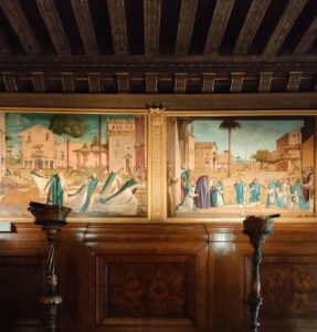 Il ciclo di teleri di Carpaccio emoziona perché è ancora integro e perché si trova nel luogo per il quale il pittore lo aveva pensato nei primi anni del 1500. Narra le storie dei santi protettori della scuola: San Giorgio, Trifone e San Girolamo. Ne racconta i momenti salienti della loro vita, con tale amore per i dettagli e tale leggerezza nell’esecuzione da risultare una meraviglia per gli occhi e per lo spirito: i fraticelli nel monastero che scappano terrorizzati alla vista del leone feroce così come il cagnolino di Sant’Agostino che si intimorisce alla vista della luce miracolosa, insieme a molti altri deliziosi particolari, rimarranno nella nostra memoria come piccole perle di bellezza.